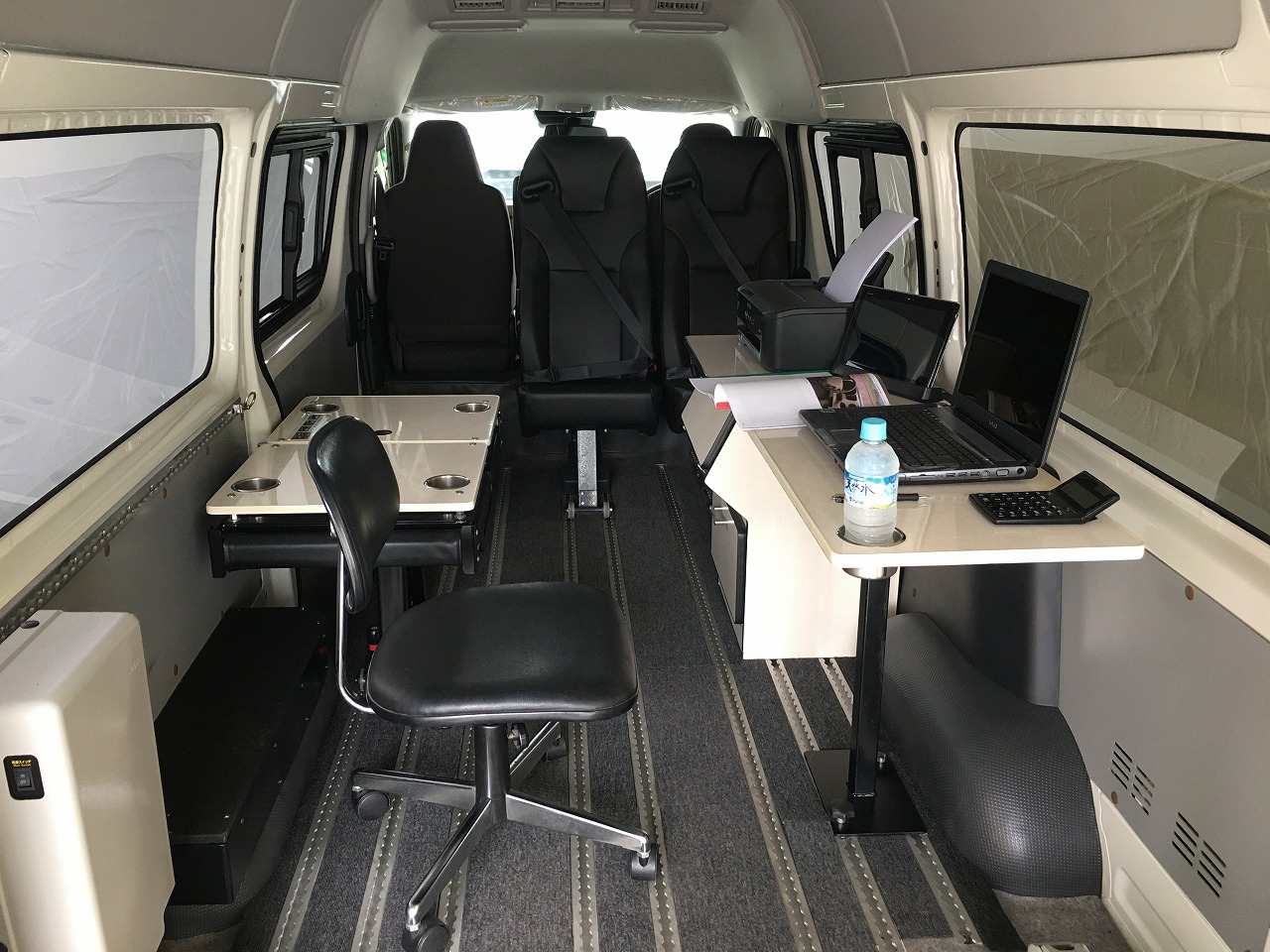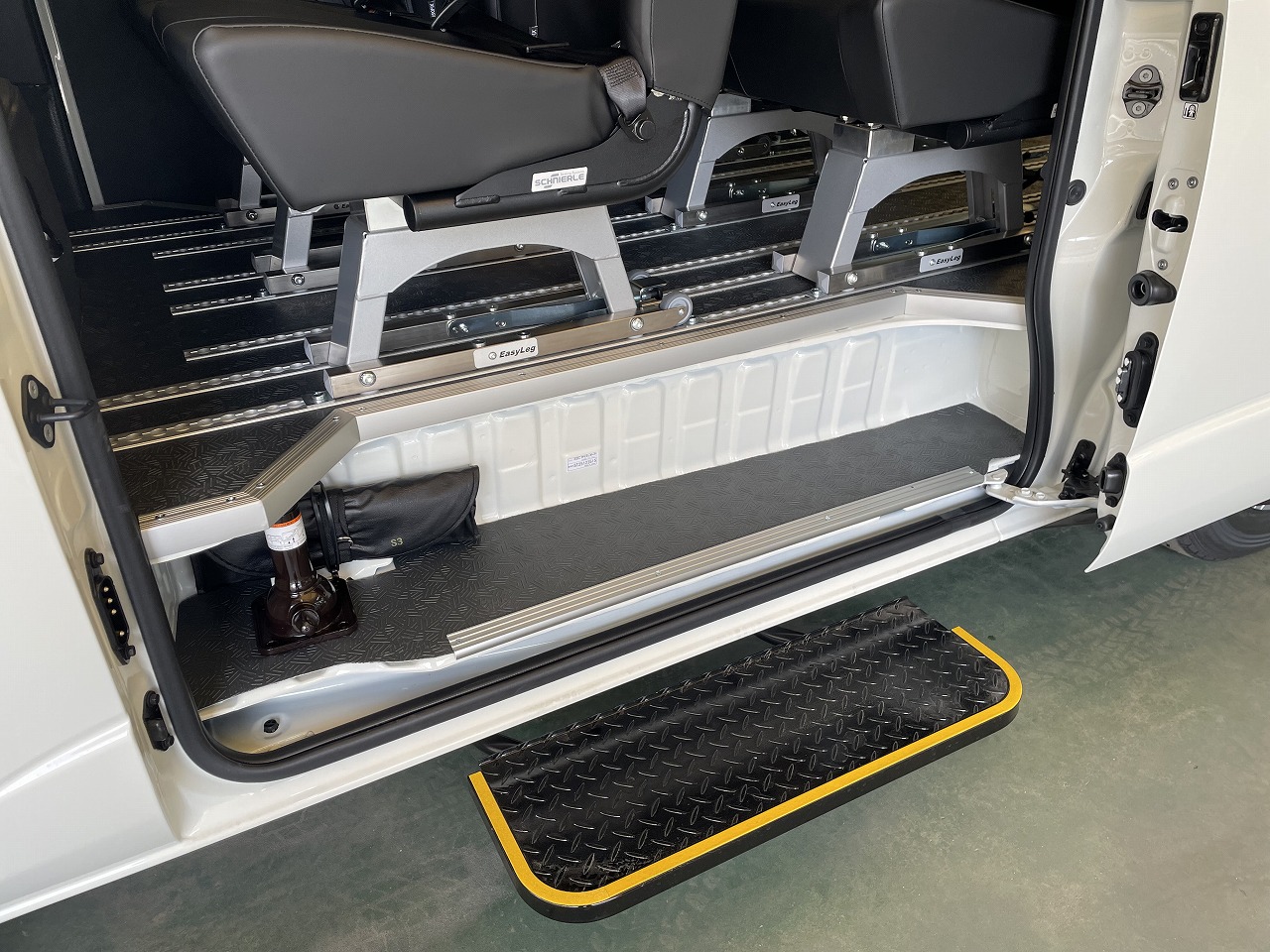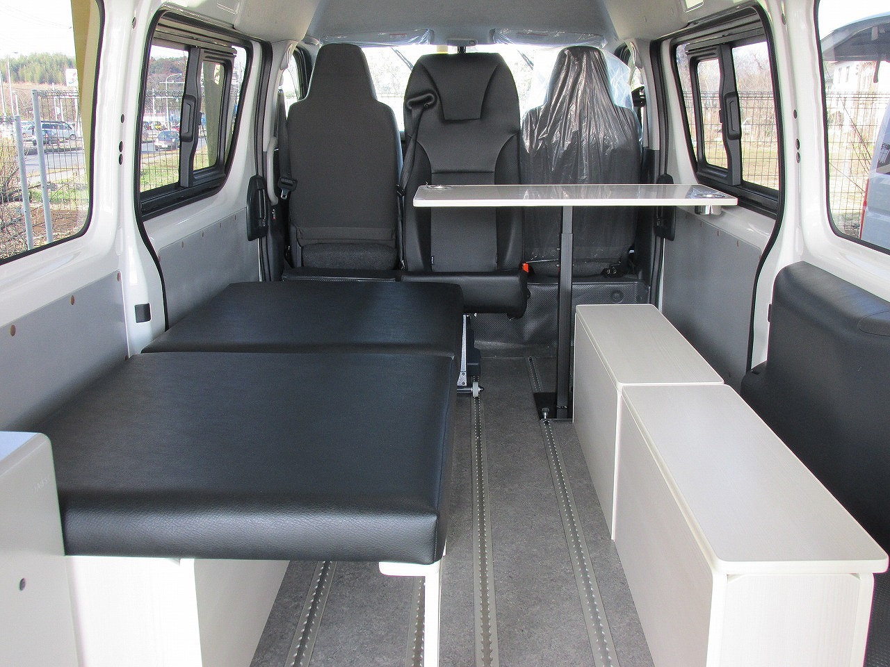 | 乗降用ステップはスライドドア連動の機械式のため(電動式ではありません)電装系のトラブルがありません。 後部座席は3点式シートベルトが内蔵されています。 注意)ご紹介画像の室内レイアウト変更風景画像の事務室設備、車中泊装備、レジャーアイテム用品等は車両に含まれておりません。また床面色、座席形状は旧モデルを表示しております。 |
