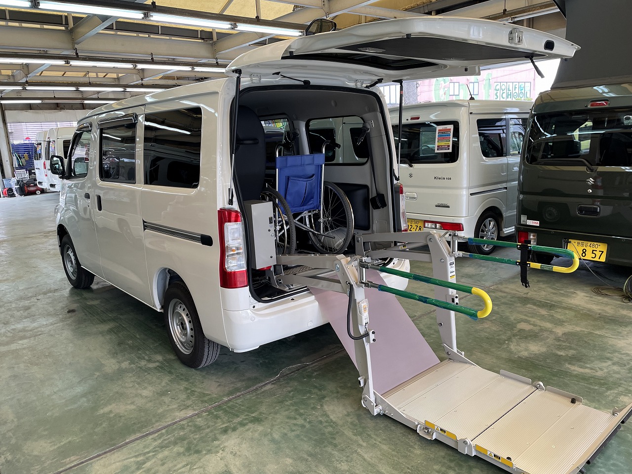 スーパーコンパクトサイズ送迎車の「タウンエース送快」の新車即納車です。室内車いすスペースを最大限にいかし全長4m6cmのコンパクトボディに車いす2脚搭載可能で快適空間と機動性がベストバランス!そして車載用ストレッチャーやフルリクライニング車いす1脚にも対応可能!乗車定員6名で送迎をバックアップします。夜間乗降用LED照明、室内収納式乗降ステップ、フロントパーテーション手摺り、WAKO製油圧電動型昇降リフト、ワンタッチ操作の車いす固定装置等は標準装備です。又、車いすで乗車の方にも3点式シートベルトが用意され安全性も向上です。